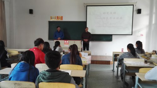 朱老师从教三十余年,具有深厚的书法功底和修养。讲座中,朱老师首先回顾了中国书法的发展历程,并带领大家认识书法在中国文化史上的地位,讲解了擫、押、钩、格、抵的握笔姿势,又从笔法,结构、章法三个方面分析了书写的三大要领。讲座中,朱老师即兴采用现场书写、提问等方式与在座师生充分互动,其生动的讲解风格和精彩的内容赢得了师生的阵阵掌声。