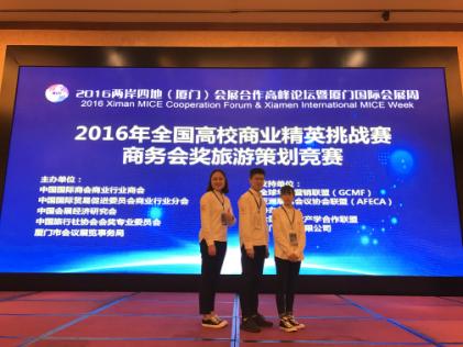 11月7日至10日,2016年全国高校商业精英挑战赛商务会奖旅游策划竞赛在厦门举行。由我校旅游学院会展策划与管理专业孟雪、巢欢娅、孙蒋业三位同学组成的项目团队在比赛中表现突出,成绩优秀,最终获得大赛展洽组一等奖,项目组三等奖的好成绩,郑伟、郭瑞两位老师荣获“优秀指导教师奖”。