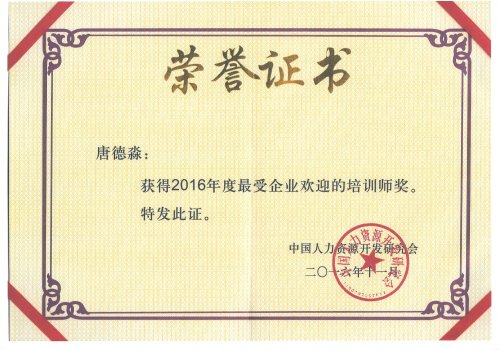 近日,贸易金融学院副院长唐德淼博士获中国人力资源开发研究会“2016年度最受企业欢迎的培训师奖”,该奖项是由中国人力资源开发研究会(国家发展和改革委员会主管的国家一级社团)“2016年中国人才发展奖”的组成部分,旨在表彰在人才发展和人才培养方面有突出成绩的个人。