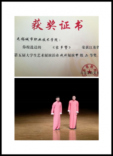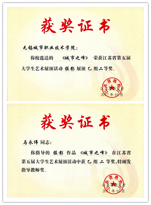 第五届艺术展演活动项目包括艺术表演类、艺术作品类等13项类别。经过现场展演,专家评选,我院传媒与艺术设计学院吴浩源同学作品《城市之峰》获得摄影展二等奖,贾弘毅同学的《园林春雨》获得摄影展三等奖,指导教师马永伟老师获得指导教师奖,陆杨、缪广佳、孙颖、张舒红四位同学的作品分别获得工艺组的三等奖。由传媒与艺术设计学院贾佳老师和淘宝影视学院秦潇璇老师共同指导的《墨迹工作坊》获得大学生艺术实践工作坊三等奖。由师范学院裴大明老师指导、由褚烟霏、褚秀峰两位同学演绎的单口相声《家乡赞》获戏剧展演甲组二等奖。