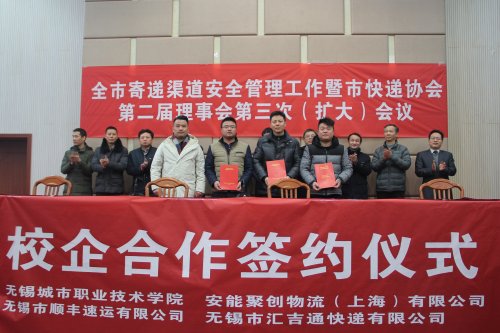 1月29日,无锡市邮政管理局、无锡市快递协会在我院组织召开全市寄递渠道安全管理工作暨市快递协会二届三次理事(扩大)会议。市快递协会会长吴建选,市邮政管理局局长陈东,市邮政管理局副局长王贵祥,市物业管理协会会长房泽峰,市快递协会秘书长朱仲贤,市综治办、市公安局、市国安局、市工商局等单位分管领导出席会议,市快递协会理事单位、全市各邮政、快递企业主要负责人参加会议。我院瞿立新副院长参加会议。 会上,瞿立新副院长向与会领导和嘉宾介绍了我院快递专业建设情况。我院是无锡市邮政管理局重点建设的邮政快递行业人才培养基地,已纳入无锡市邮政业发展“十三五”规划。我院物流管理(快递方向)2017年被教育部、国家邮政局认定为“全国职业院校邮政和快递类示范专业点”。瞿立新副院长指出,学院将继续以务实的态度推进快递专业建设和人才培养工作,2018年将设置快递运营管理专业,努力打造集实践教学、社会培训、技能鉴定为一体的高品质物流快递人才培养基地,为我市邮政、快递行业输送更多的优秀人才。 无锡市邮政管理局、无锡市快递协会领导充分肯定我院快递专业建设所取得的成绩,并表示“培养邮政、快递业专业人才”是政府与行业协会的一项重要工作,今后将继续大力支持我院国家级示范专业点的建设,引导全市快递企业与学校深化产教融合、校企合作,将我院打造成全市邮政快递人才的高地,为全市邮政快递产业提档升级提供重要的人才支撑。 会上,无锡市人民政府原副市长、市快递协会会长吴建选为我院“全国职业院校邮政和快递类示范专业点”授牌,瞿立新副院长代表学院接牌。 会上,瞿立新副院长代表我院与安能聚创物流(上海)有限公司、无锡市顺丰速运有限公司、无锡市汇吉通快递有限公司三家公司负责人签署校企合作战略协议。 全市快递业2017年度盛会在我院召开 我院物流管理(快递方向)2017年被教育部、国家邮政局认定为“全国职业院校邮政和快递类示范专业点” 我院与安能聚创物流(上海)有限公司、无锡市顺丰速运有限公司、无锡市汇吉通快递有限公司签订校企合作战略协议 |