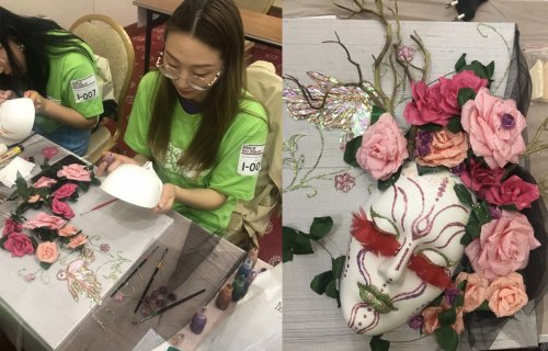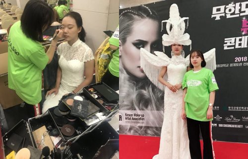 2018“韩国无限挑战美妆大赛”于当地时间5月19日傍晚在首尔市世宗大学圆满结束。我院影视学院人物形象设计专业的两位学子与来自韩国、日本、菲律宾都等12个国家和地区的1500名选手同场竞技,一路过关斩将,最终王嘉琪同学摘得梦幻新娘组金奖,胡笑颖同学喜获假面组彩绘银奖。影视学院负责人秦潇璇应邀担任本次大赛评委和颁奖嘉宾。
