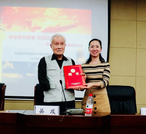 为铭记红色历史,传承革命精神,10月24日下午,物联网工程学院特邀新四军老战士、独臂老英雄吴成来校作专场事迹报告会,物联网工程学院党总支副书记高丽金、学生支部党员及2018级学生近200人参加了活动,学生支部李铭老师主持。 今年90高龄的吴成老先生是一名革命战争幸存者,在“苏中七战七捷”战斗中负伤截去右下臂,自1952年起他走上了革命传统教育讲台,至今已宣讲6000余场,并在政府的支持下建立了“吴成革命传统教育基地”。吴成老先生几十年年如一日,用宣讲革命传统、弘扬爱国主义的实际行动,生动鲜活地诠释了习近平总书记指出的“坚持和发扬党的革命传统和优良作风,能够为培育和践行社会主义核心价值观提供丰厚营养,使社会主义核心价值观更加具有震撼人心、塑造灵魂的作用”这一重大课题。 在一个多小时的活动中,他讲述了亲身经历的战斗故事以及其他战斗英雄们可歌可泣的感人事迹,在场的师生在老英雄亲述的革命故事中汲取精神力量,激扬爱国热情,坚定理想信念。物联网工程学院党总支副书记高丽金现场向吴成老先生颁发聘书,聘请吴成同志为“习之社”指导教师。 据了解,在本学期初,物联网工程学院学生支部及“习之社”成员到吴成老先生创办的“革命传统教育基地”参观学习。 本次讲座活动,使物联网工程学院师生在思想和心灵上都受到了一次洗礼,深切地感受到红色革命之火的生生不息,坚定了将革命精神扎根心中的信念。物联网工程学院党总支将通过此类革命传统教育,使广大青年团学骨干牢记历史使命、认清自我价值、明确奋斗目标,不忘初心、自强奋进。(撰稿:杨旭娇) 新四军老战士、独臂老英雄吴成作专场报告 物联网工程学院党总支副书记高丽金向吴成老先生颁发聘书 |