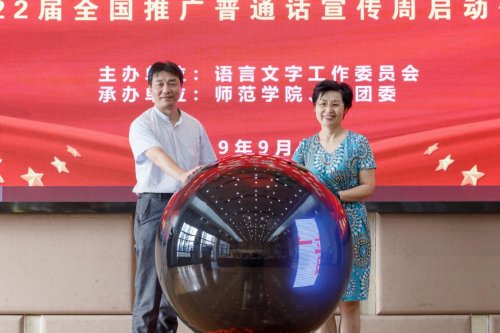 今年全国推普周时间为9月16日至22日,主题为“普通话诵七十华诞,规范字书爱国情怀”。在启动仪式上,无锡市教育局副局长、无锡市语委办主任吴洵如和我校党委副书记俞力元共同点亮了第22届全国推广普通话宣传周启动球。