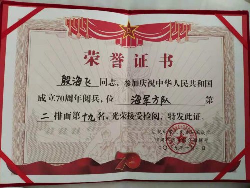 10月1日上午,庆祝中华人民共和国成立70周年大会在北京天安门广场隆重举行!我校全体师生通过电视、手机、互联网等多种方式观看了盛大的阅兵仪式,令人欣喜的是,在威武雄壮的海军方阵中,有一名无锡城市职业技术学院学子位列其中。 这个帅气小伙名叫殷海飞,是我校传媒与艺术设计学院2017级广告设计与制作专业的学生。2018年暑假,即将升入大学二年级的他,毅然响应国家鼓励大学生应征入伍的号召,光荣入伍,服役于海军青岛某部队。在部队第一年,被推荐参加了士官培训,经过严格选拔,获得了参加国庆阅兵的资格,因其表现出色,综合条件优异,被安排在海军方阵的第二排中间位置。阅兵当天,殷海飞同学和方阵的全体战士一起,意气风发、豪情满怀,接受祖国和人民的检阅,成为了所有城院人的骄傲! 从左往右第二位为殷海飞 荣誉证书 |