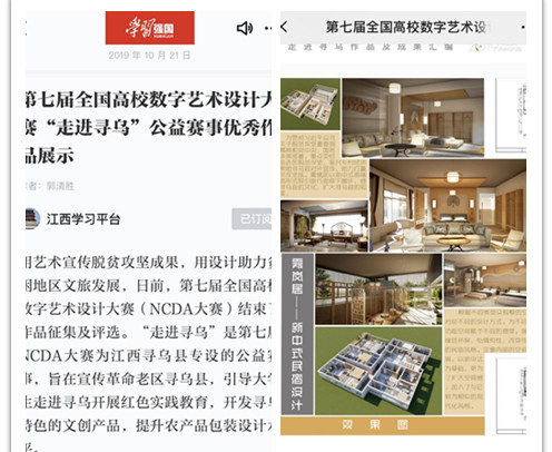 近日,我校传媒与艺术设计学院朱琳、赵黎菊两位同学的设计作品《雾岚居——新中式民宿设计》,登上了“学习强国”江西学习平台。 《雾岚居——新中式民宿设计》是两位同学在第七届全国高校数字艺术设计大赛(NCDA大赛)“走进寻乌”主题赛事的获奖作品。为了让学生的设计作品充满人文情怀,专业指导教师陆晓俊以“绿色环保,怡情悦性”的创作思路指导学生,在指导老师的建议下,学生们在设计的过程中最大限度的保留了寻乌地方传统文化元素,将中式元素与现代材质巧妙融合,吸引旅行者停下脚步,感受寻乌县地方文化,扩大寻乌县知名度。 |