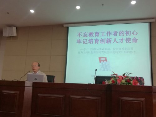 10月23日中午,副校长王远东在南校区报告厅上了一堂以“不忘教育工作者初心,牢记培育创新人才使命”为主题的党课。师范学院和建筑与环境工程学院全体党员到会学习。 副校长王远东讲授党课 王远东以习近平主席《加快从要素驱动、投资规模驱动发展为主向以创新驱动发展为主的转变》讲话为纲领,围绕习近平总书记对创新型青年人才的期待、青少年学生创新能力的差距与不足、贯彻习近平总书记讲话的学校行动策略、让青少年学生创新在校园蔚然成风等四个方面展开全面的阐述。他强调了创新的重要性,分析了当前青年学生创新意识薄弱的原因,给出了解决问题的方法建议,并以生动详实的案例讲解了专利申请的步骤与方法。王远东强调,只要教育系统全员行动,我们完全可以大幅度提升青少年学生的创新能力,如习近平总书记所说“加快形成一支规模宏大、富有创新精神、勇于承担风险的创新型人才队伍”。 党课现场 通过党课的学习,与会党员同志对“不忘教育工作初心、牢记培育创新人才使命”的意义有了深刻的理解,对努力的方向有了进一步的认识。 |