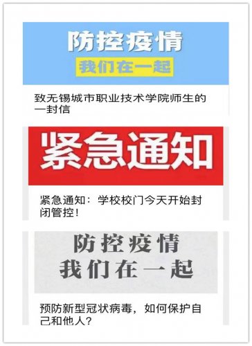 加强防控宣传教育。学校疫情防控工作领导小组通过微信公众号、微信群、QQ群等渠道持续开展新型冠状病毒感染的肺炎的防控宣传教育,发布“致无锡城市职业技术学院各级党组织和全体共产党员的一封信”“致无锡城市职业技术学院师生的一封信”“致无锡城市职业技术学院全体辅导员、班主任的一封信”,向师生宣传普及新型肺炎传播途径、症状和防范知识和措施,引导广大师生以科学的方式防范疫情;提醒师生不提前返校,不参加各类聚集性活动,避免引发疫情扩散;提醒师生理性判断各类网络信息,做到不恐慌、不信谣、不传谣,以平和的心态面对疫情,传递抗击疫情的正能量;号召全体师生员工、党员干部齐心协力、群防群控,切实做好疫情防控工作。