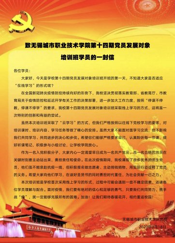 党校本着“领悟初心使命,从严从实管理”的原则,制定了相应的考核规定,要求学员做到日日打卡,互相监督。此外,党校还撰写了“致城院第十四期党员发展对象培训班学员的一封信”,向学员们提出了希望与祝福,希望同学们明确入党动机,端正学习态度,严格要求自己,积极向党组织靠拢,凝聚起共同战“疫”的强大力量,以实际行动接受党组织的长期考验。