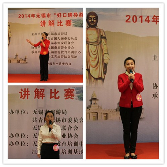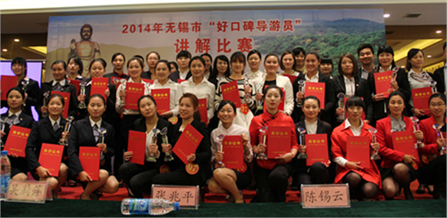 评选活动现场比赛选手风采嘉宾及选手合影为全面展示无锡导游队伍的良好形象,提升导游人员的服务质量和综合素质水平,激发导游队伍在旅游业中的正能量,10月16日下午,由无锡市旅游局、市妇联和团市委共同举办的2014年“无锡市好口碑导游员”讲解比赛在我院智慧酒店举行。学院旅游系积极协助此项活动的举办。