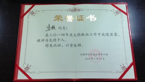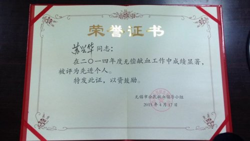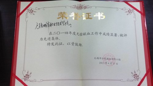 近日,无锡市公民献血领导小组下发了《关于表彰2014年度无锡市无偿献血先进集体和先进个人的决定》,我院被评为2014年度市无偿献血先进集体,学工处处长苏兴华和院团委柴艳被评为先进个人。